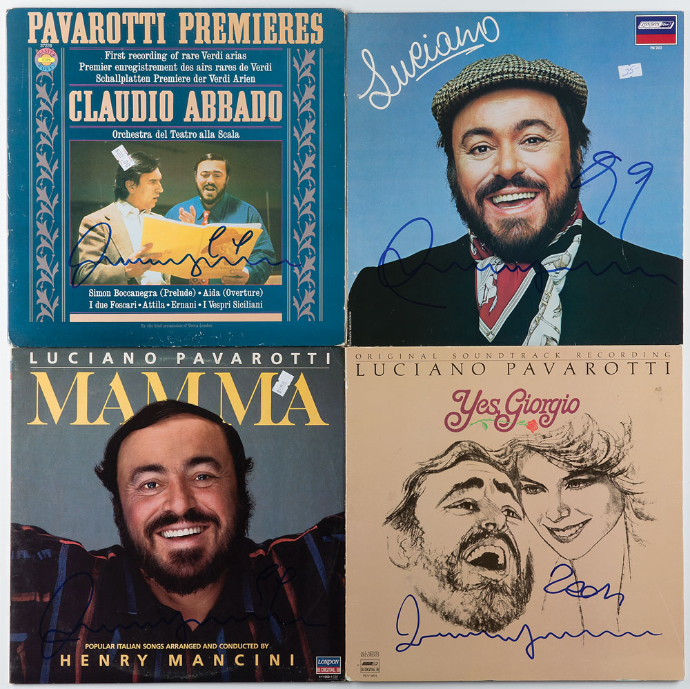 Four albums signed on the front cover in blue felt tip by Luciano Pavarotti, including: Luciano, Mamma, Pavarotti Premieres Verdi Arias, and the 'Yes, Giorgio' soundtrack. In overall very good to fine condition, with price stickers affixed to three of the albums. The records are included. From The John Brennan In-person Autograph Collection.