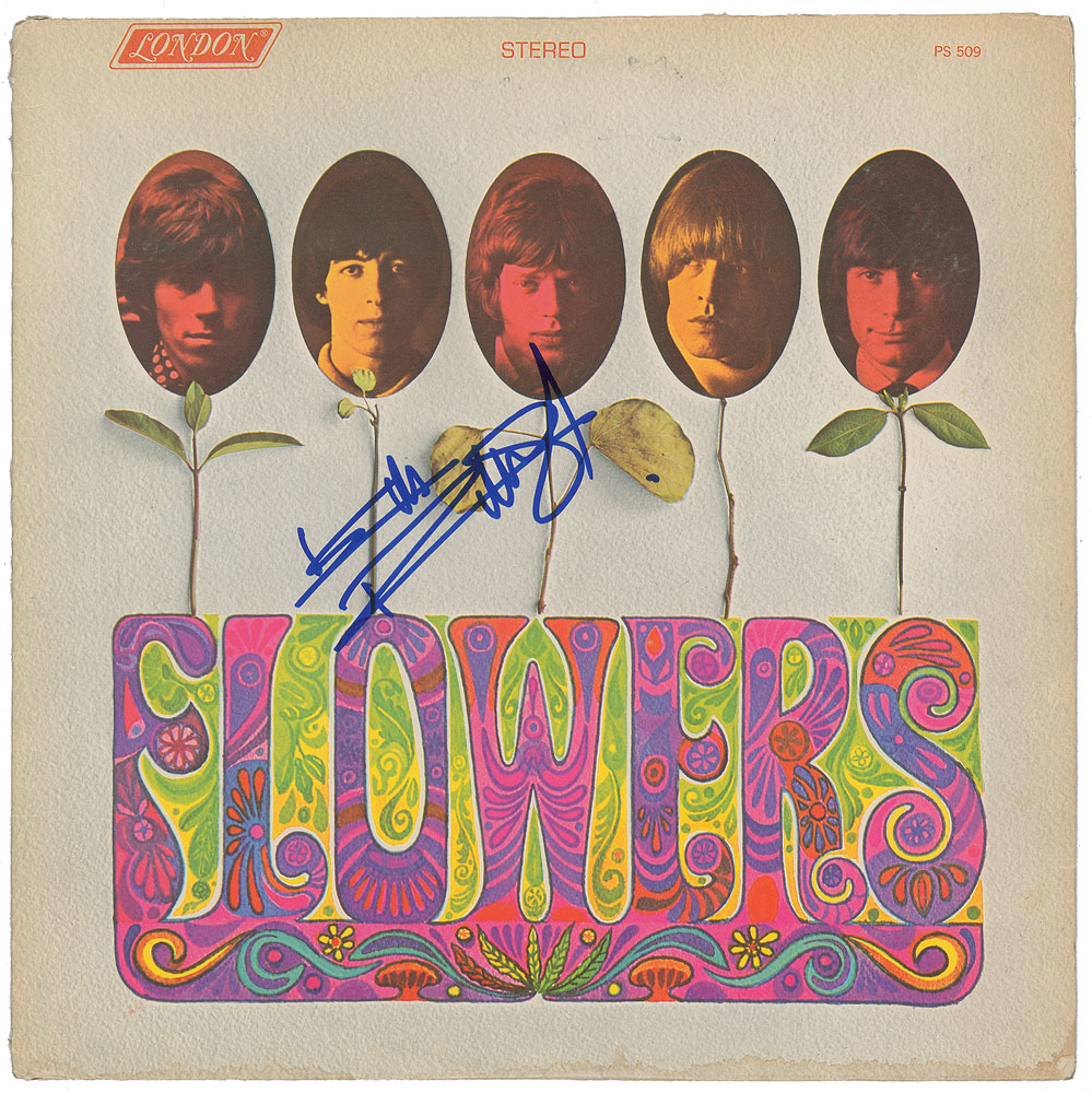 Flowers album by the Rolling Stones, signed on the front cover in blue felt tip by Keith Richards. In fine condition, with light dampstaining along the bottom edge. The record is included. From The John Brennan In-person Autograph Collection.