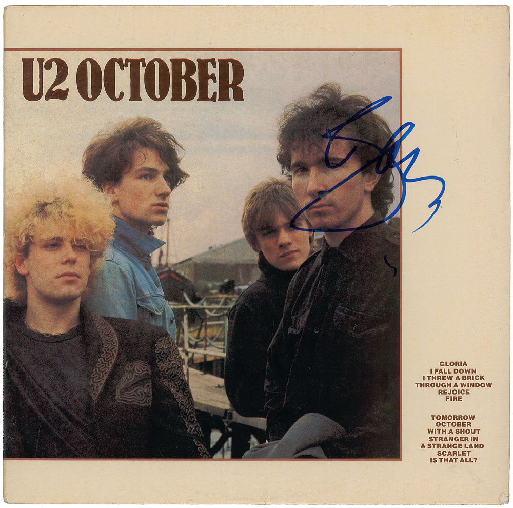 October album by U2, signed on the front cover in blue felt tip by Bono. In fine condition, with creasing to the upper left. The record is included. From The John Brennan In-person Autograph Collection.