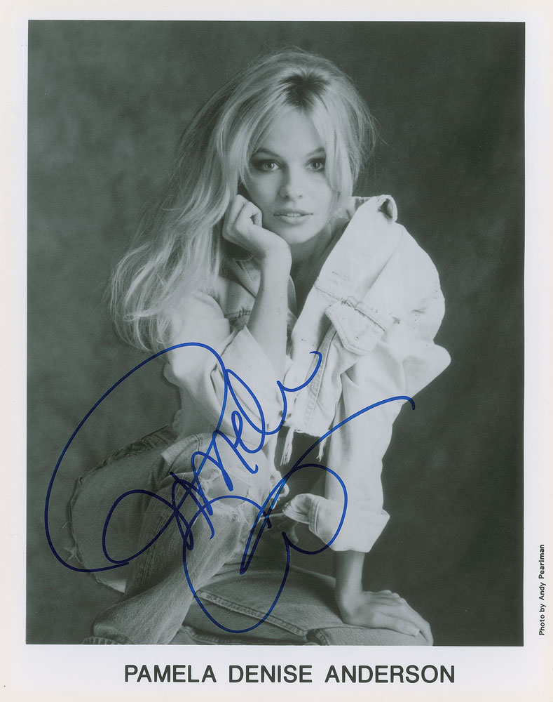 Satin-finish 8 x 10 publicity photo of Pamela Anderson early into her career, signed prominently in blue felt tip. In fine condition. From The John Brennan In-person Autograph Collection.