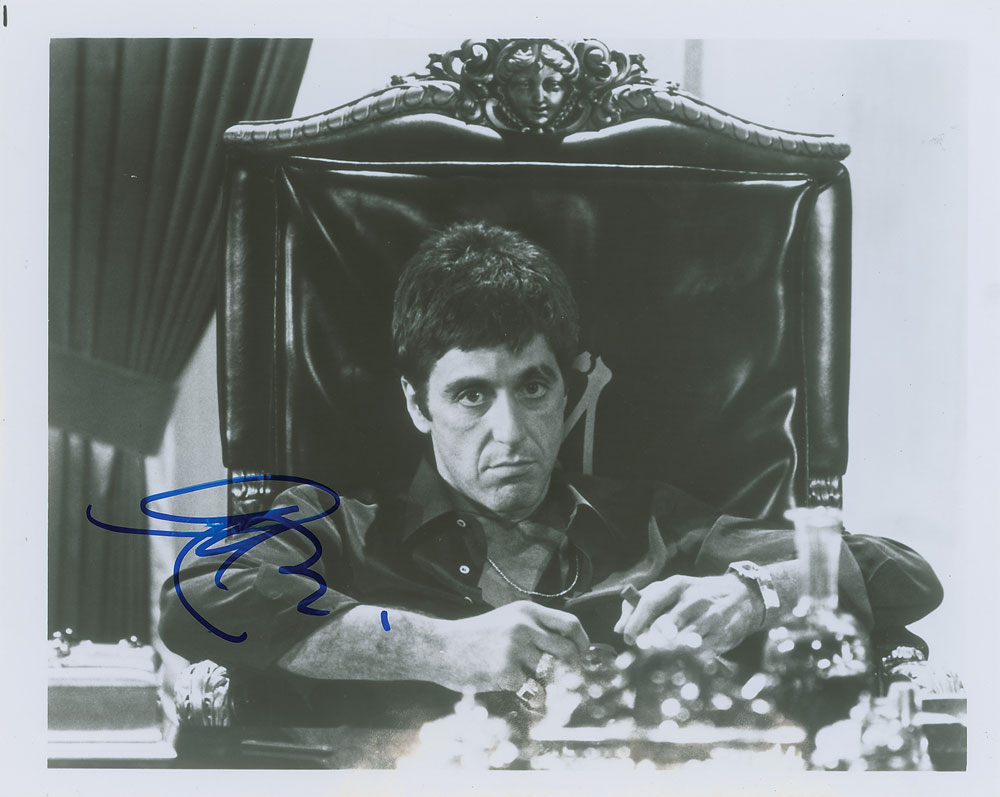 Glossy 10 x 8 photo of Al Pacino as drug lord Tony Montana from the 1983 crime film Scarface, signed in blue felt tip. In fine condition. From The John Brennan In-person Autograph Collection.