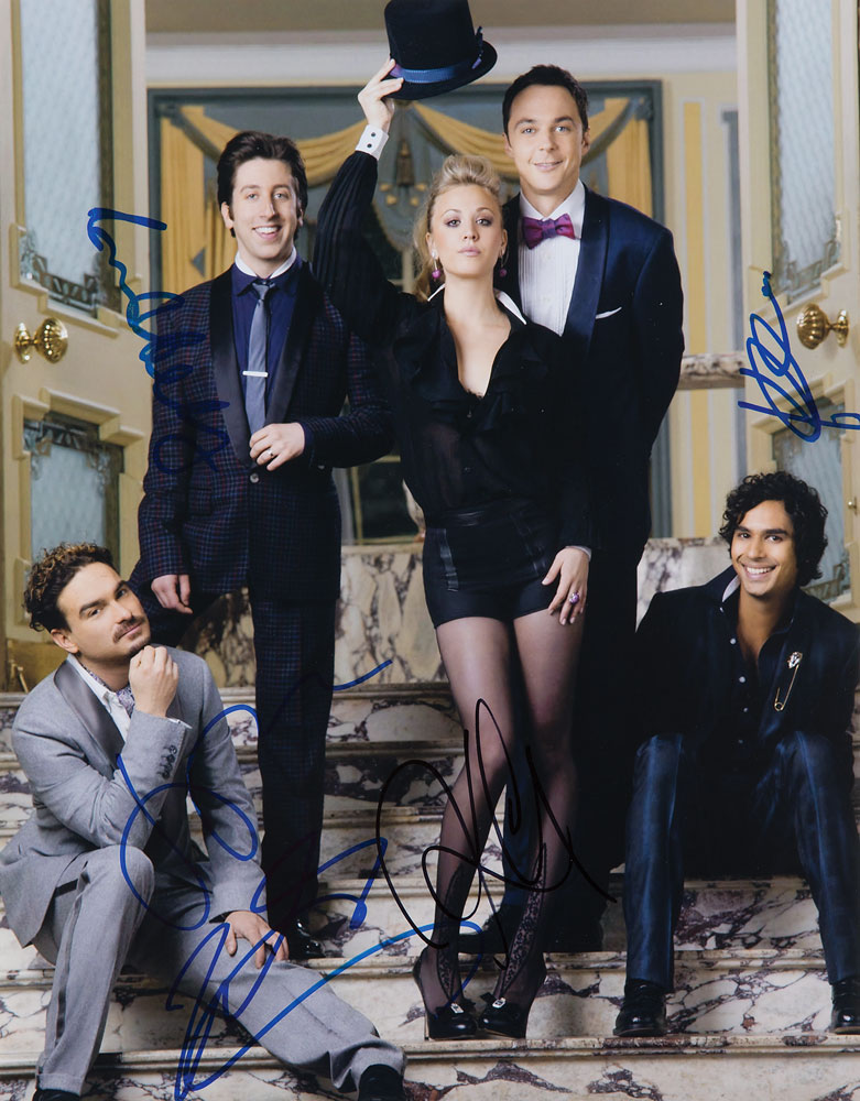 Color satin-finish 11 x 14 photo of the modishly dressed stars of The Big Bang Theory, signed in blue or black felt tip by Jim Parsons, Kaley Cuoco, Simon Helberg, Johnny Galecki, and Kunal Nayyar. In fine condition, with a few light creases. From The John Brennan In-person Autograph Collection.