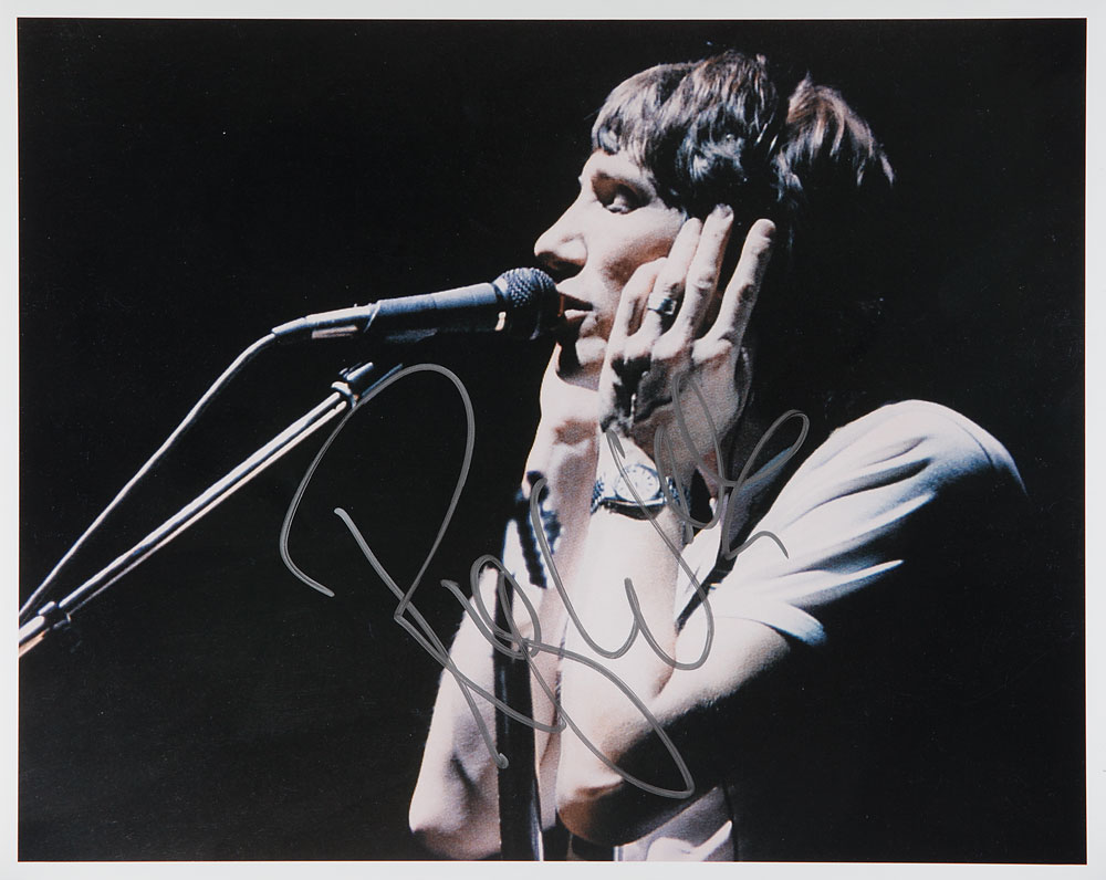 Color satin-finish 14 x 12 photo of Roger Waters singing passionately into a microphone against a dark background, signed prominently in silver ink. In fine condition. From The John Brennan In-person Autograph Collection.