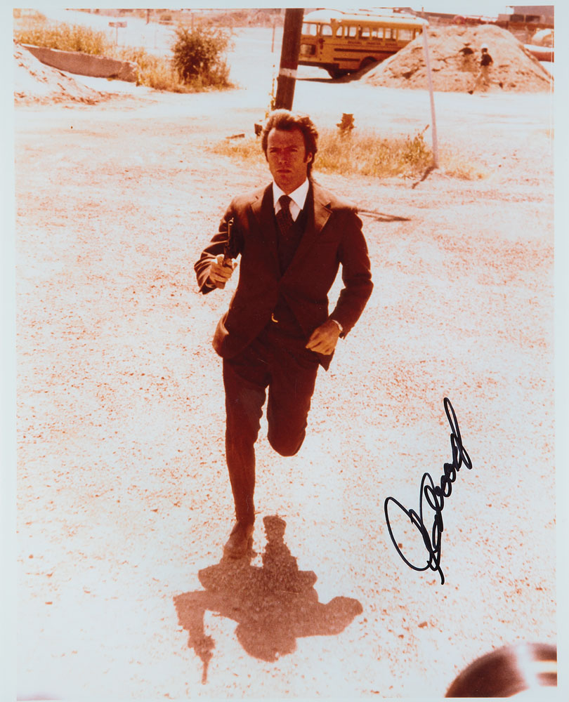 Color satin-finish 11.25 x 14 full-length photo of Clint Eastwood running with a gun in the 1971 film Dirty Harry, signed in black felt tip. In fine condition. From The John Brennan In-person Autograph Collection.