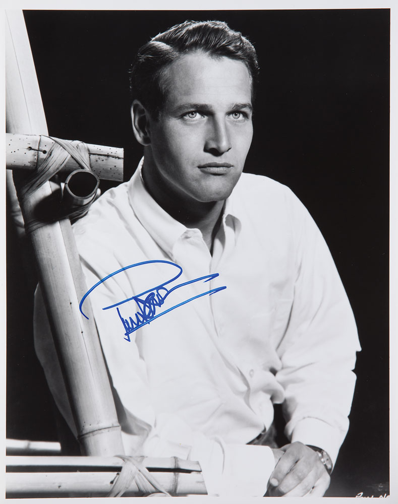 Handsome satin-finish 11 x 14 photo of Paul Newman early in his career as a leading man, signed in blue felt tip. Reverse bears an affixed Beckett Authentication Services label. In very fine condition. From The John Brennan In-person Autograph Collection.