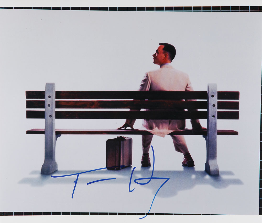 Color glossy 14 x 12 photo of Tom Hanks in his Oscar-winning title role from the 1994 film Forrest Gump, signed in blue felt tip. In fine condition. From The John Brennan In-person Autograph Collection.