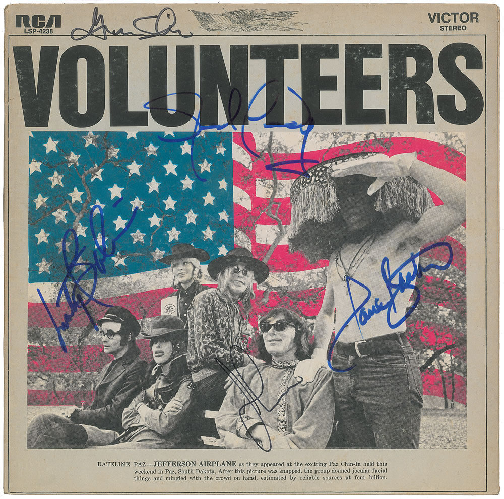 Volunteers album signed on the front cover in blue or black felt tip by Grace Slick, Paul Kantner, Marty Balin, Jorma Kaukonen, and Jack Casady In fine condition. The record is included. From The John Brennan In-person Autograph Collection.