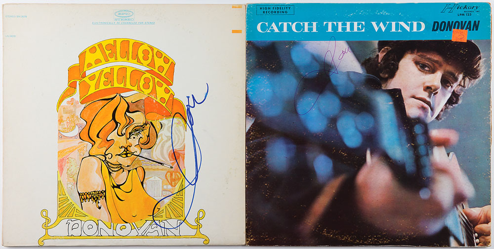 Two albums signed by Donovan: Catch the Wind, signed in purple ballpoint; and Mellow Yellow, signed in blue felt tip. In overall fine condition, with light scuffing. The records are included. From The John Brennan In-person Autograph Collection.