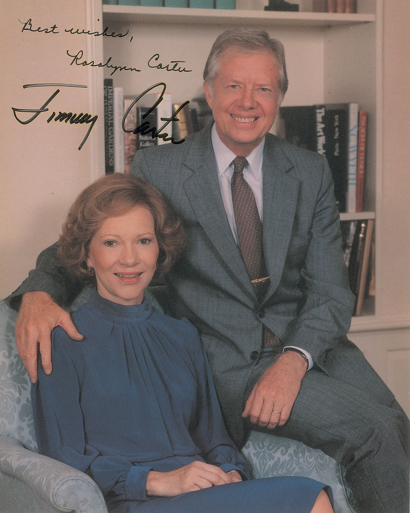 Color 8 x 10 cardstock photo of the Carters together, signed in black felt tip, "Jimmy Carter" and "Best wishes, Rosalynn Carter." In fine condition.