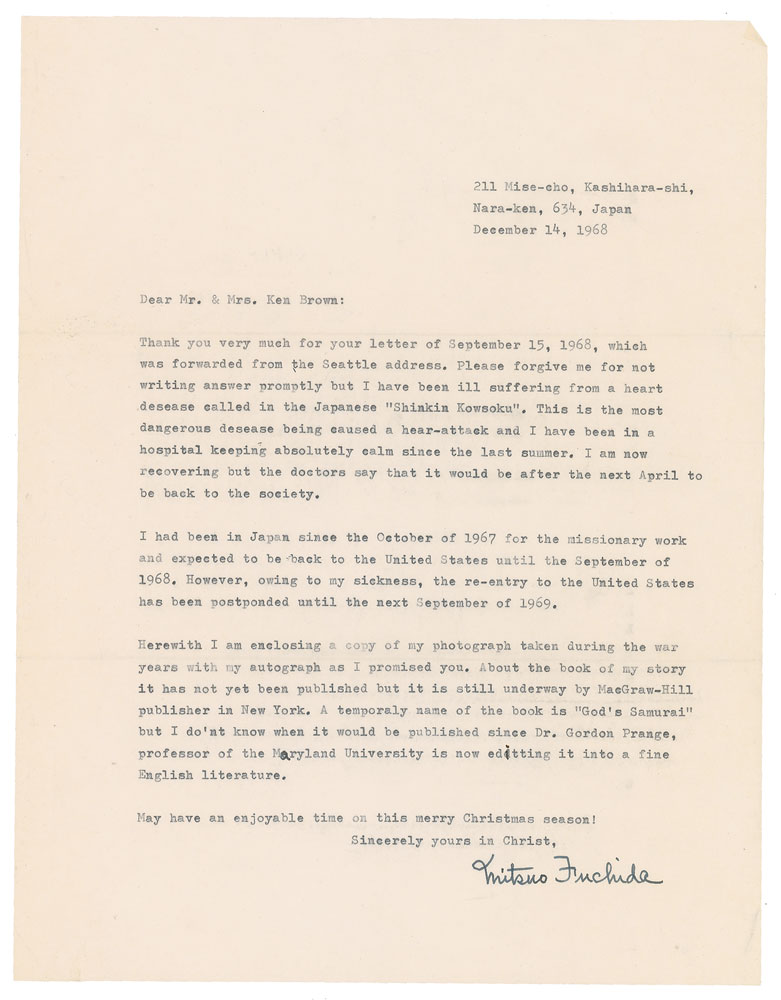 One of Japan's most skilled fliers, Fuchida (1902-1976) commanded the air attack against Pearl Harbor on December 7, 1941, and was the last to leave the battle area. After World War II, Fuchida converted to Christianity and became a nondenominational preacher, traveling frequently to America and later becoming a US citizen. TLS, one page, 8.5 x 11, December 14, 1968. Letter to Mr. and Mrs. Ken Brown, in part: "Please forgive me for not writing answer promptly but I have been ill suffering from a heart disease called in the Japanese 'Shinkin Kowsoku.' This is the most dangerous desease being caused a hear-attack and I have been in a hospital keeping absolutely calm since the last summer. I am now recovering but the doctors say that it would be after the next April to be back to the society…About the book of my story it has not yet been published but it is still underway by MacGraw-Hill publisher in New York. A temporaly name of the book is 'God's Samurai' but I do'nt know when it would be published since Dr. Gordon Prange, professor of the Maryland University is now editting it into a fine English literature." In fine condition. Accompanied by the original mailing envelope.