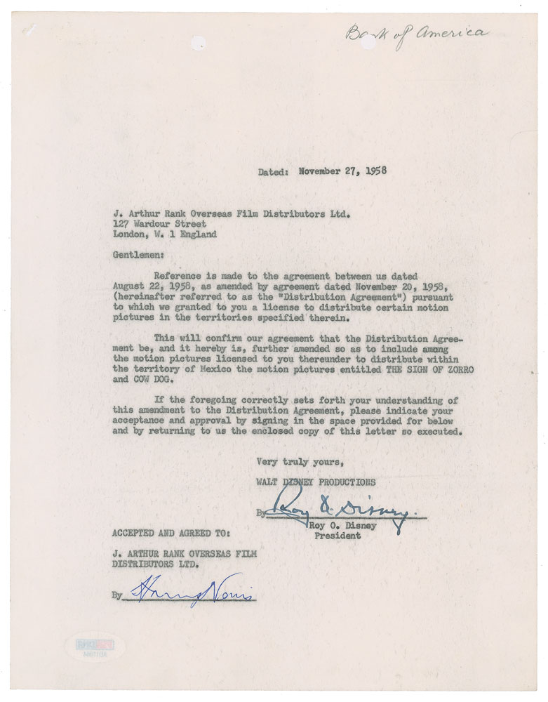 Younger brother Walt Disney and co-founder of Walt Disney Productions (1893-1971). DS, one page, 8.5 x 11, November 27, 1958. Agreement between Walt Disney Productions and J. Arthur Bank Overseas Film Distributors Ltd., in part: "This will confirm our agreement that the Distribution Agreement be, and it hereby is, further amended so as to include among the motion pictures licensed to you thereunder to distribute within the territory of Mexico the motion pictures entitled The Sign of Zorro and Cow Dog." Signed at the conclusion in fountain pen by Roy O. Disney as president. In fine condition, with a PSA/DNA label affixed to the reverse (certificate of authenticity not present).