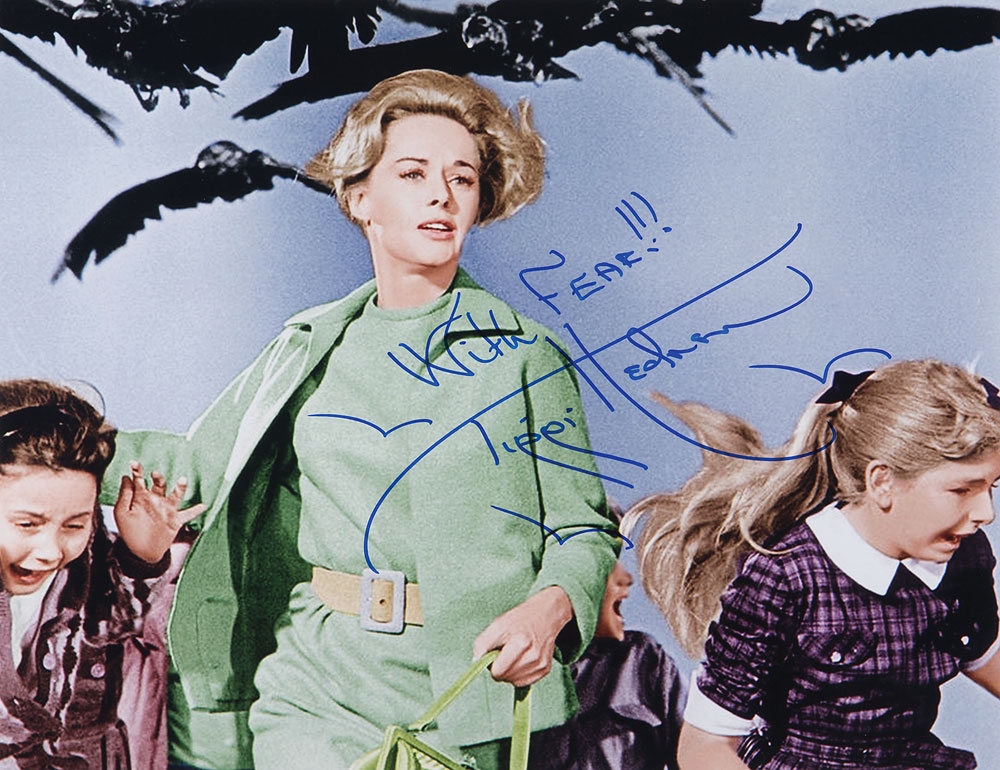 Color satin-finish 14 x 11 photo of Hedren in Alfred Hitchcock's horror-thriller The Birds, signed in blue felt tip, "With Fear!!! Tippi Hedren." In fine condition, with slightly grainy image quality. Originally obtained by in-person specialist Mike Wehrmann.