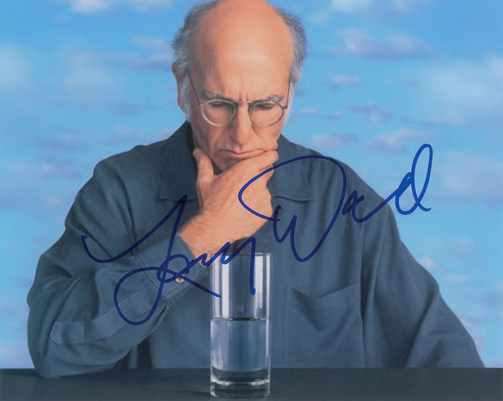 Color glossy 10 x 8 photo of the Curb Your Enthusiasm creator, signed in blue felt tip. In fine condition. Originally obtained by in-person specialist Mike Wehrmann.