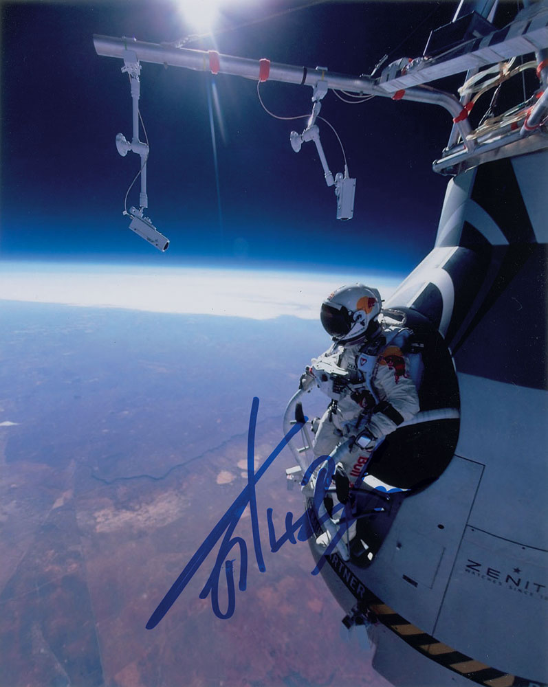 Austrian skydiver and daredevil (born 1969) who jumped to Earth from a helium balloon in the stratosphere in 2012, setting a world record for skydiving at approximately 24 miles. Color satin-finish 8 x 10 photo of Baumgartner emerging from his capsule and preparing to jump, signed in blue felt tip. In fine condition. Originally obtained by in-person specialist Mike Wehrmann.
