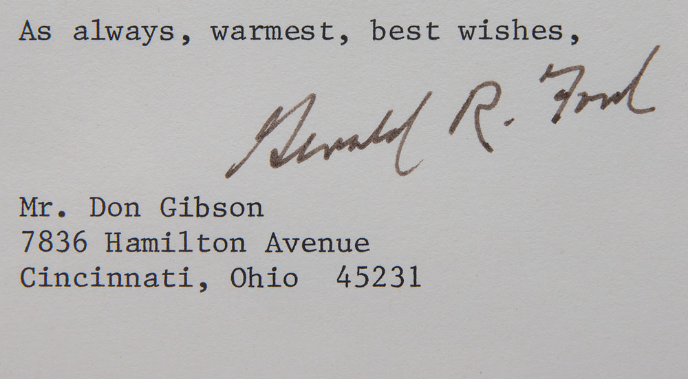 TLS signed “Gerald R. Ford,” one page, 6.5 x 9.5, personal letterhead, June 4, 1985. Letter to Don Gibson, in part: "Thank you so much for the beautiful MacArthur book. The General was one of my military favorites, and I shall always remember as a relatively new member of the Congress his magnificent speech at a Joint Session of the House and Senate. Sorry I was so preoccupied with my golfing obligations at Muirfield that I didn't have time to chat." Nicely matted and framed with a portrait to an overall size of 20.5 x 12.5. In fine condition.