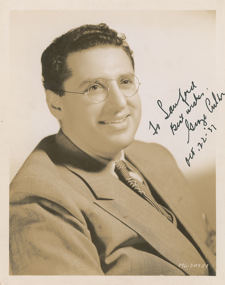 Vintage glossy 8 x 10 studio portrait of the director in a formal bust-length pose, signed and inscribed in black ink, "To Sanford, Best wishes, George Cukor, Oct. 22- '37.” In fine condition, with a light vertical surface crease which passes through Cukor's face.