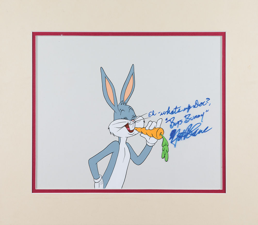 Original production cel showing Bugs Bunny eating a carrot, signed and inscribed in blue felt tip by the iconic character's legendary voice actor, "Eh—what's up Doc? 'Bugs Bunny,' Mel Blanc." Character image measures 5 x 7.75, with a mat opening of 11.5 x 9.5; matted on the reverse is the original matching production drawing, accomplished in graphite and colored pencil on animation paper. Matted to an overall size of 16 x 14. In fine condition, with an old label to the upper left corner of the mat.