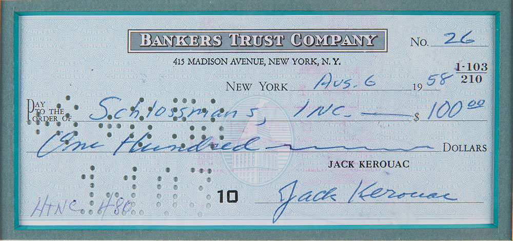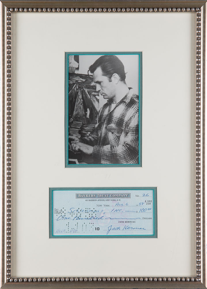 Personal check, 5.75 x 2.5, filled out and signed by Kerouac, "Jack Kerouac," payable to Schlossman's, Inc. for $100, August 6, 1958. Nicely double-matted and framed with a portrait to an overall size of 12 x 16.5. In fine condition. A desirable example from the year he published The Dharma Bums, a sequel to his classic On the Road.