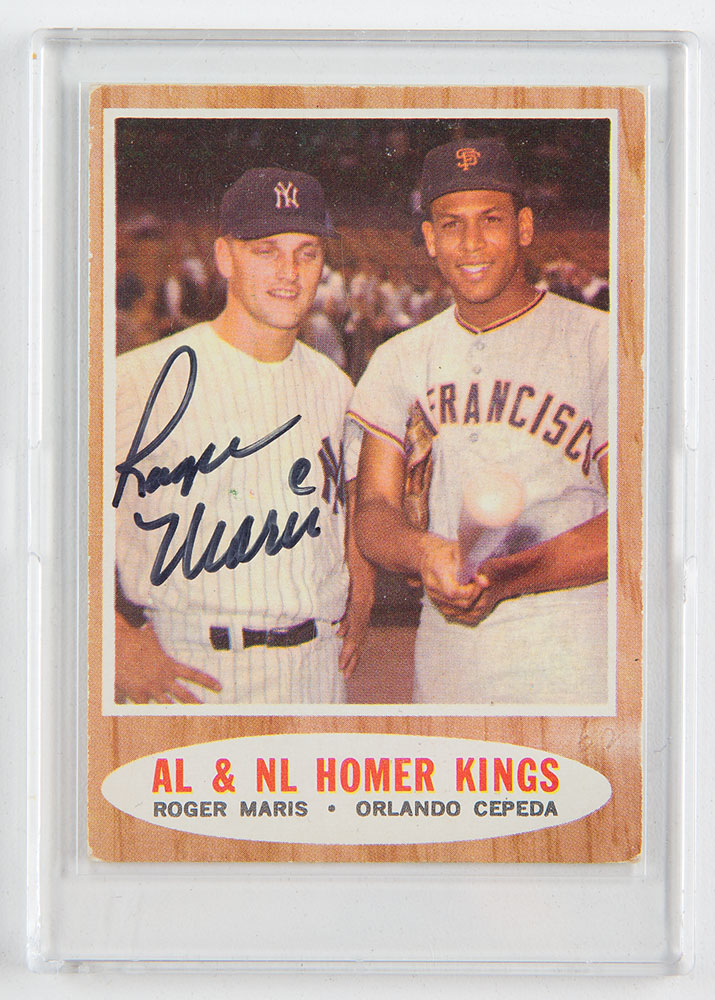 1962 Topps baseball card, No. 401, featuring "AL & NL Homer Kings, Roger Maris-Orlando Cepeda," signed on the front in black felt tip by Maris. In very good to fine condition, with slightly rounded corners and an erased pencil notation. Maris won the American League MVP in 1960 and 1961.
