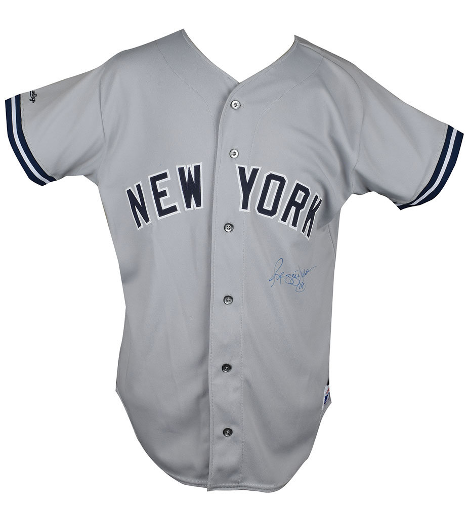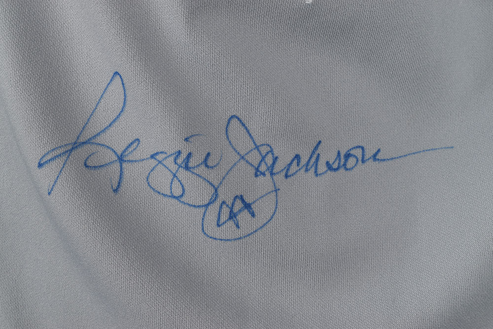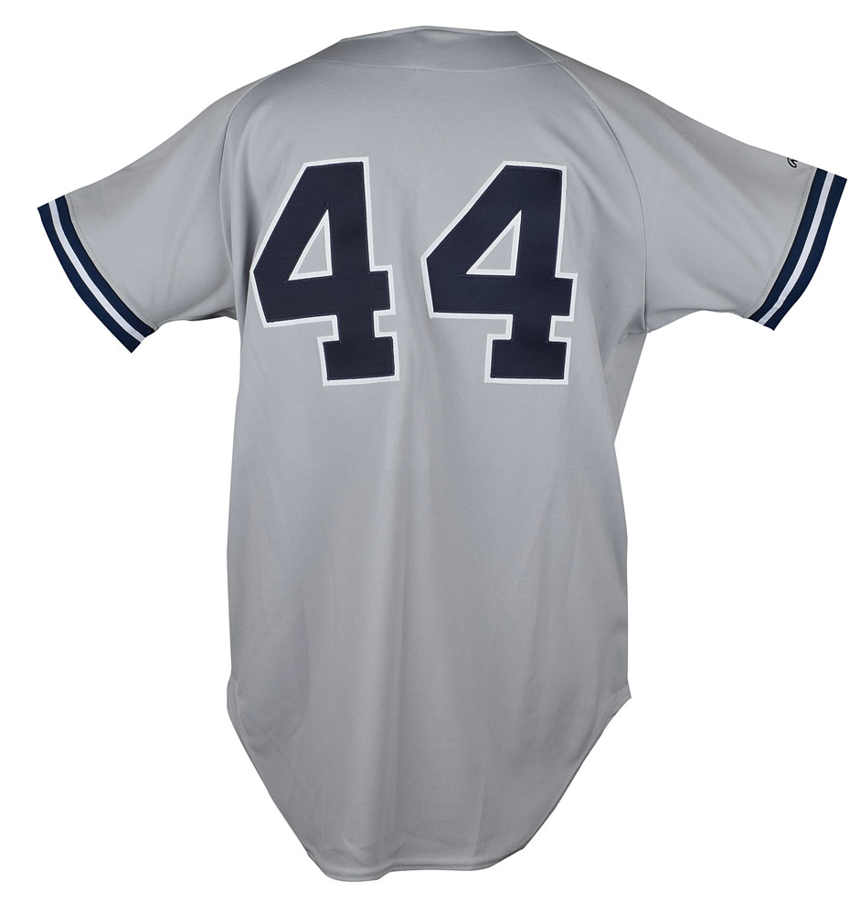 Official Rawlings replica New York Yankees baseball jersey, polyester, adult size 44, with sewn on logo and numbers, signed on the front in blue felt tip, "Reggie Jackson, 44." In fine condition.