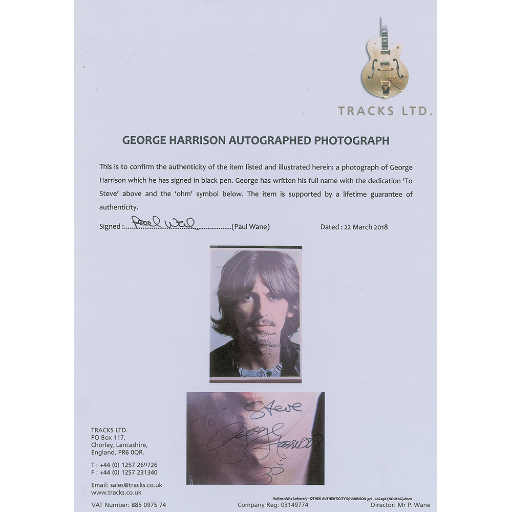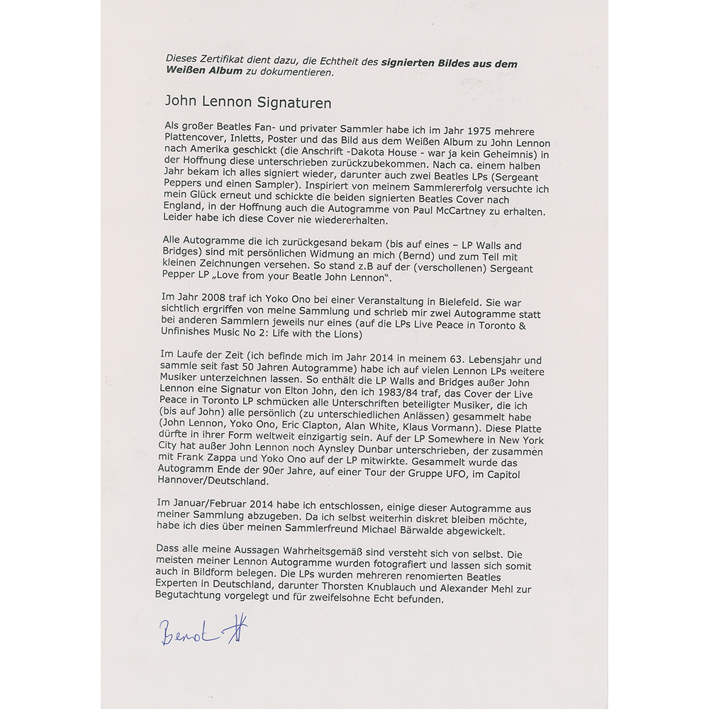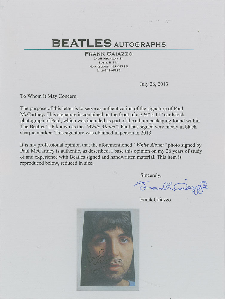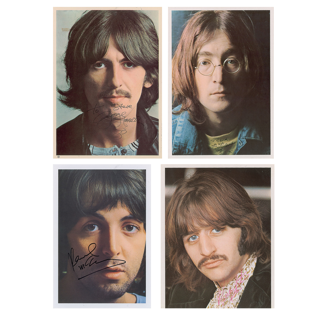 An incredibly rare, full set of all four ‘White Album’ photographic portraits included with the packaging for the Beatles’ classic self-titled 1968 album, each signed in ballpoint or felt tip by the pictured musician. The Lennon portrait measures 7.75 x 11.25 and is signed and inscribed in black ballpoint, “To Bernd, with love, John Lennon, 75,” who adds a small facial caricature of himself below (signed through the mail for a German collector); the Harrison portrait measures 7.75 x 10.75 and is signed and inscribed in black ink, “To Steve, George Harrison,” who adds an Om symbol; the McCartney portrait measures 7.5 x 11 and is signed prominently in black felt tip, “Paul McCartney,” with the reverse bearing an Apple Corp. Ltd. copyright stamp (signed on May 26, 2013, at approximately 11:55 PM at Signature FBO Flight Support private airfield at Memphis International Airport); and the Starr portrait, with trimmed bottom edge, measures 7.75 x 10 and is signed nicely in red ballpoint, “Ringo Starr.” The Harrison portrait is light paperstock, whereas the other photos are of a heavier cardstock. In overall fine condition, with a small crease to Lennon, light creasing and a small tape stain to Harrison, and light rippling and aforesaid trimmed bottom border to Starr. The John, Paul, and Ringo photos are accompanied by letters of authenticity from noted Beatles expert Frank Caiazzo, and the George photo is accompanied by a certificate of authenticity from Tracks. The White Album—long recognized as one of the best albums of all time—celebrates its 50th anniversary in November 2018, making this remarkable complete set of signed lithographs an especially timely offering.