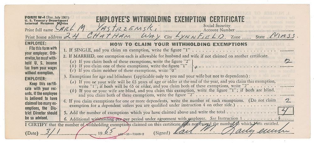 DS, signed “Carl M. Yastrzemski,” one page, 7.75 x 3.5, March 1, 1965. Employee's withholding exemption certificate filled out by Yastrzemski with his name and address, "Carl M. Yastrzemski, 24 Chatham Way, Lynnfield, Mass.," indicating a withholding exemption of "4," signed at the conclusion by Yastrzemski. In fine condition, with a Beckett label affixed to the reverse. Accompanied by a certificate of authenticity from Beckett Authentication Services. At the time he filled out this document, Yaz was heading into his fifth season with the Boston Red Sox—one in which he was named an American League All-Star and won a Gold Glove.