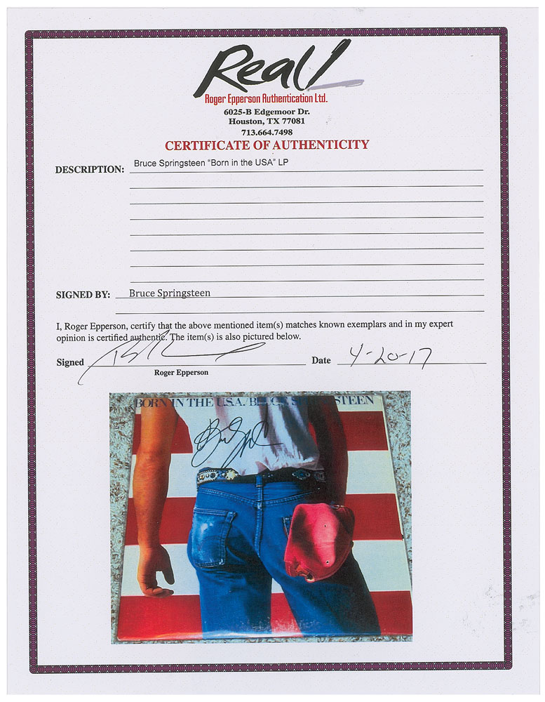 Born in the USA album signed on the front cover in black felt tip by Springsteen. In fine condition, with light scuffing and scratching. The record is included. Accompanied by a full letter of authenticity from REAL. Released in 1984, Born in the USA met with great critical and commercial success, and today is universally recognized as one of the greatest albums of all time.