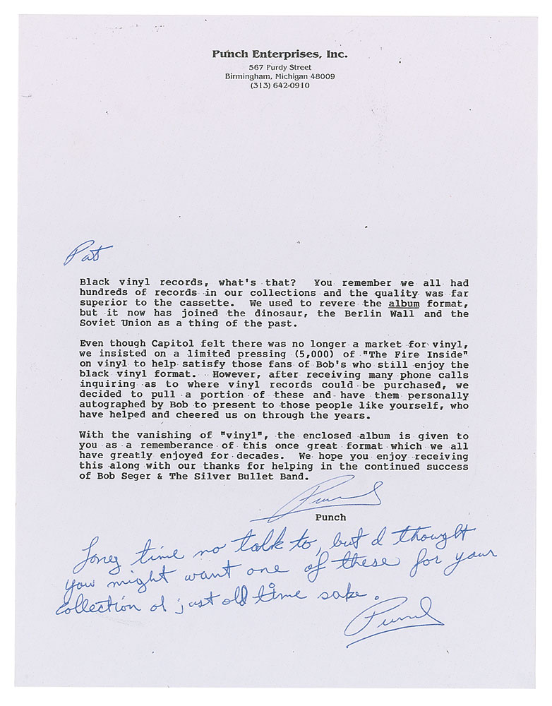 Scarce The Fire Inside album signed on the front cover in black felt tip by Seger. In fine condition, with light corner creasing. The record is included. Accompanied by a letter from Punch Enterprises explaining the release of this album in a limited pressing of 5,000, a small number of which were set aside to be signed by Seger for his fans.