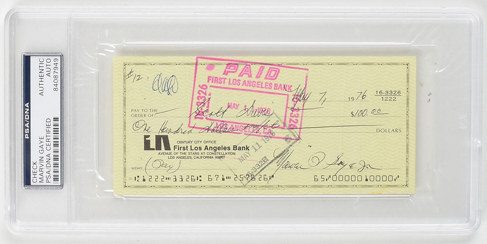 Bank check, 6 x 2.75, filled out and signed by Gaye, "Marvin P. Gaye, Jr.," payable to Scott Davie for $100, May 7, 1976. Encapsulated in a plastic PSA/DNA authentication holder. In fine condition.