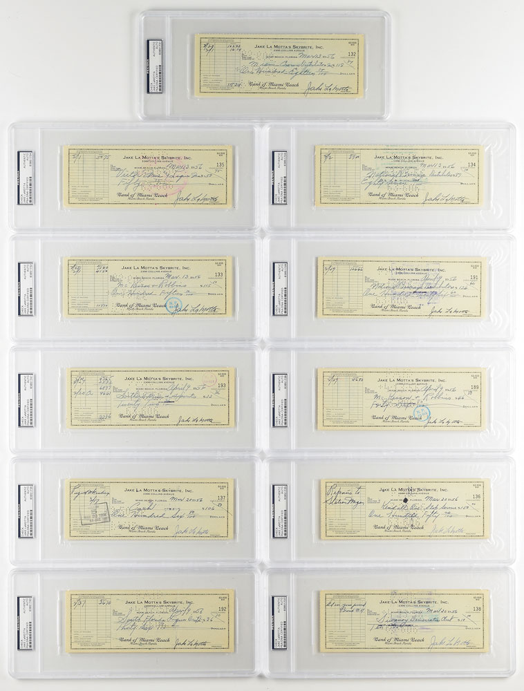 Collection of 11 business checks for Jake LaMotta's Skybrite, Inc., each filled out in another hand and signed by LaMotta, "Jake LaMotta," 8.25 x 3, dated March-April 1956. All are encapsulated in plastic PSA/DNA authentication holders. In fine condition.
