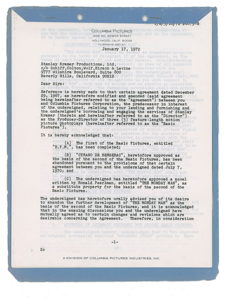 DS, fourteen pages, 8.5 x 11, May 15, 1972. Agreement between Kramer and Columbia Pictures, related to his contract to direct three films, discussing R.P.M., Cyrano de Bergerac, The Monday Man (abandoned), and Oklahoma Crude (to replace The Monday Man). The document outlines financial considerations, budgets, and approvals related to the production of Oklahoma Crude. Signed at the conclusion in ballpoint by Kramer. In fine condition. Accompanied by a full letter of authenticity from PSA/DNA.