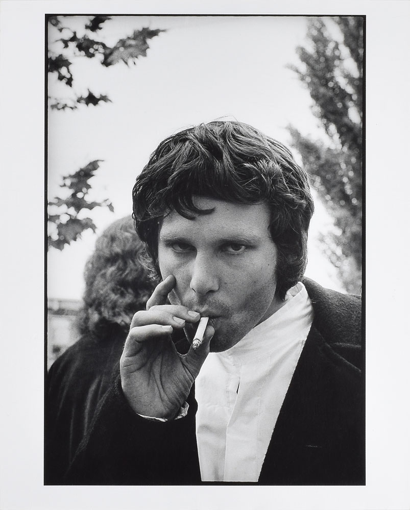 Huge original semi-glossy 16 x 20 hand-printed Jim Marshall photograph of Doors singer Jim Morrison smoking a cigarette backstage at the Northern California Folk-Rock Festival in San Jose, 1968. Reverse bears Marshall's studio stamp and negative number. In fine condition.