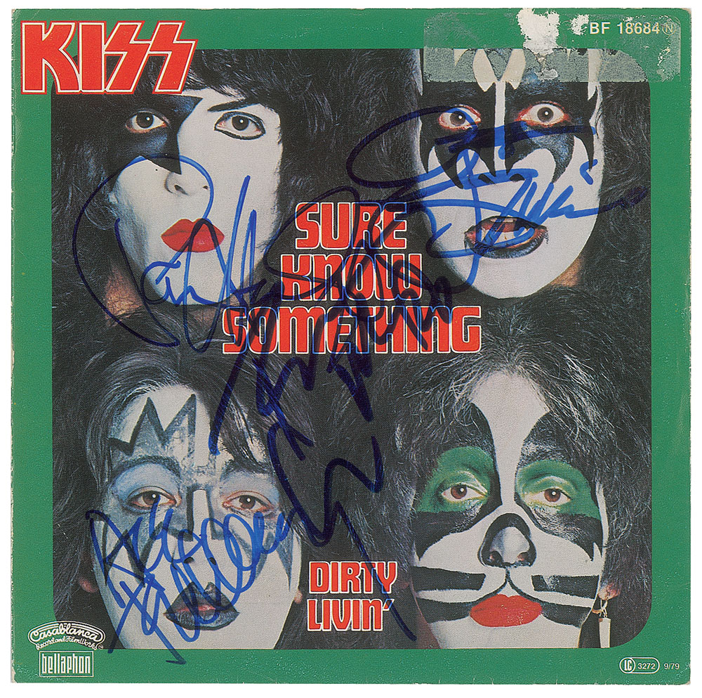 Casablanca 45 RPM single record for 'Sure Know Something / Dirty Livin',' signed on the sleeve in blue felt tip by Paul Stanley, Ace Frehley, Gene Simmons, and Peter Criss. In very good to fine condition, with surface loss and sticker residue to Simmons' forehead. The record is included. From The John Brennan In-person Autograph Collection.