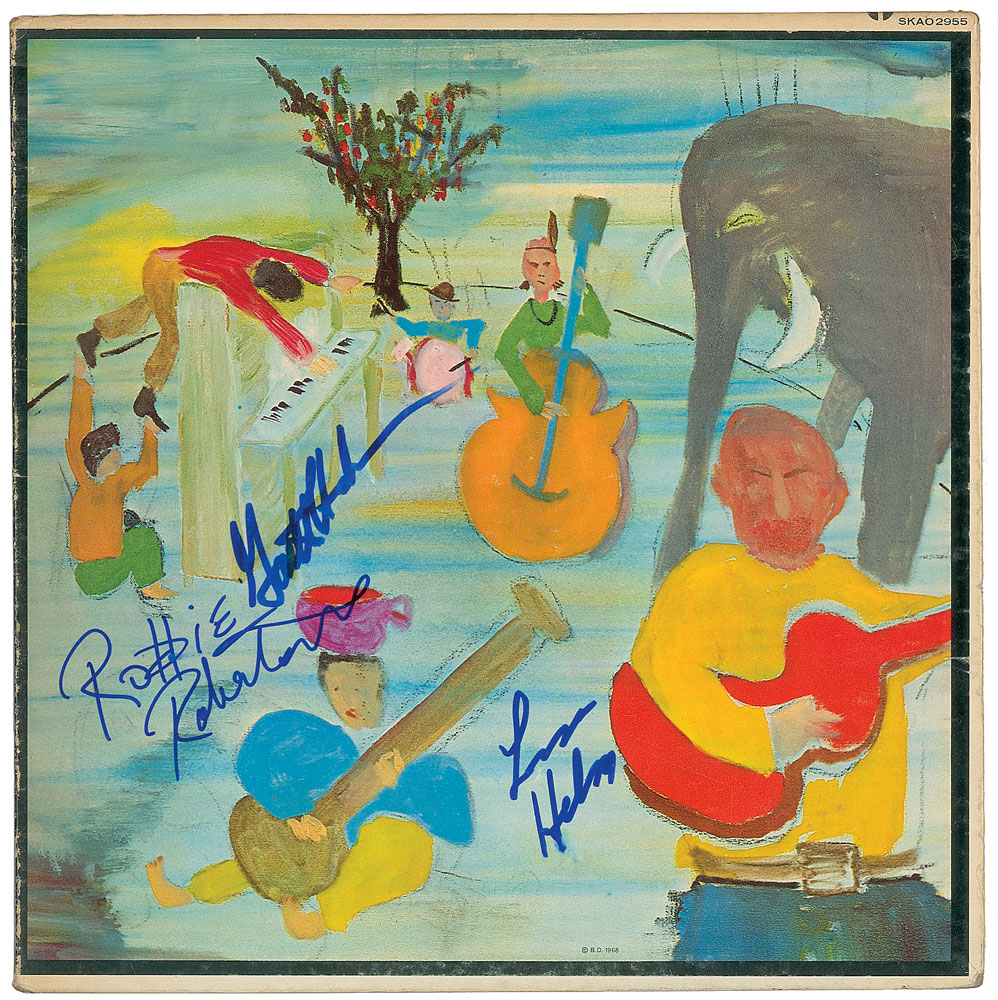 Music from Big Pink album signed on the front cover in blue felt tip by Levon Helm, Garth Hudson, and Robbie Robertson. In fine condition, with some light edge wear. The record is included. From The John Brennan In-person Autograph Collection.