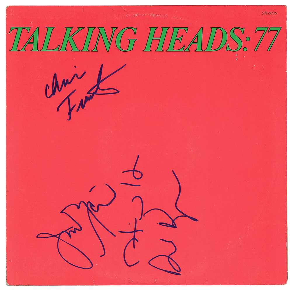 Talking Heads: 77 album signed on the front cover in blue felt tip by David Byrne, Chris Frantz, Jerry Harrison, and Tina Weymouth. In fine condition, with light scuffing. The record is included. A desirable example of the Talking Heads' debut, featuring the single 'Psycho Killer.' From The John Brennan In-person Autograph Collection.
