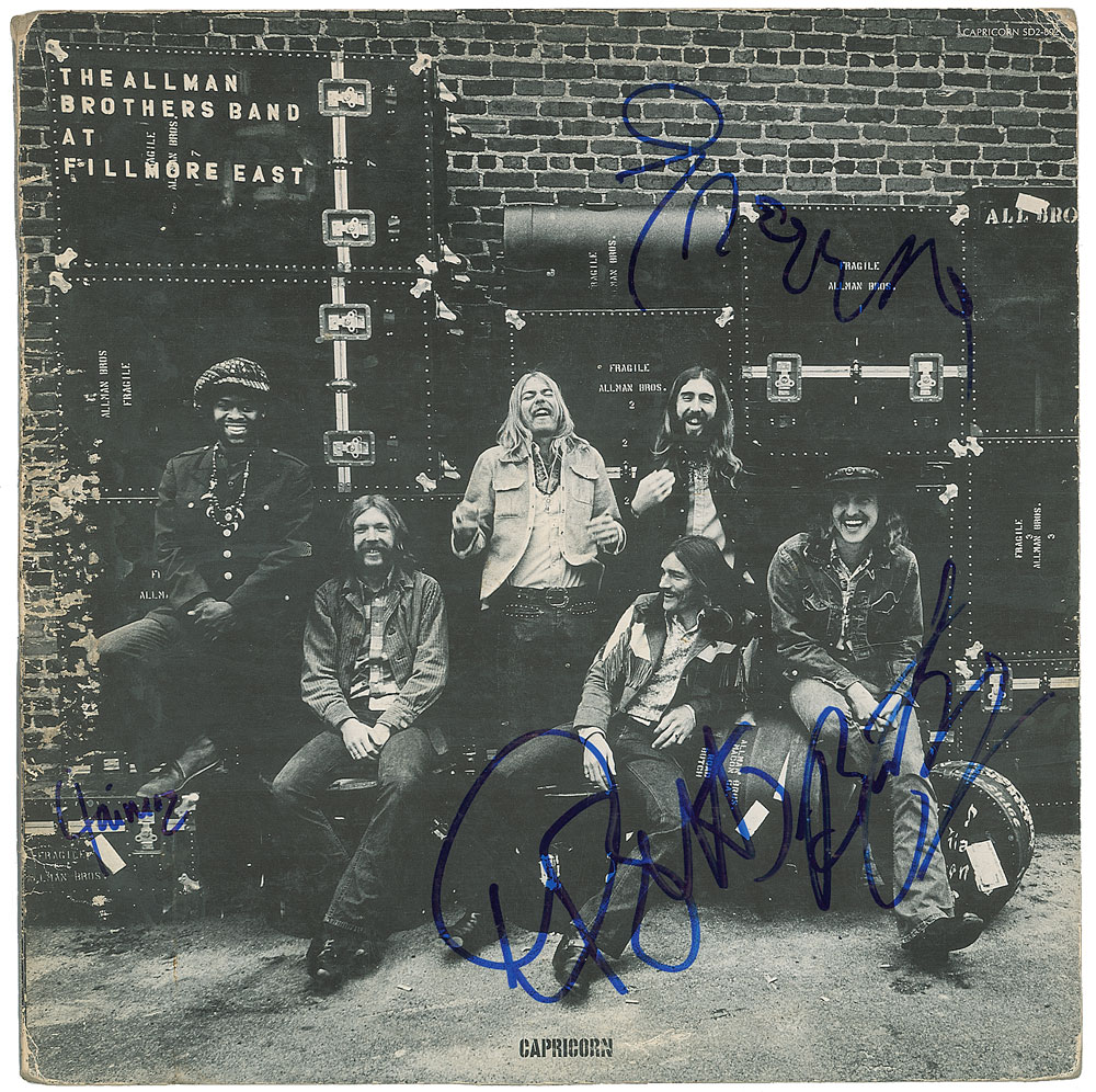 At Fillmore East album signed on the front cover in blue felt tip by Gregg Allman, Jaimoe, Dickey Betts, and Butch Trucks. In fine condition, with some light edge wear. The record is included. Considered by some critics to be one of the greatest live albums in rock music, At Fillmore East was the band's artistic and commercial breakthrough, and was their first album to earn platinum status. From The John Brennan In-person Autograph Collection.