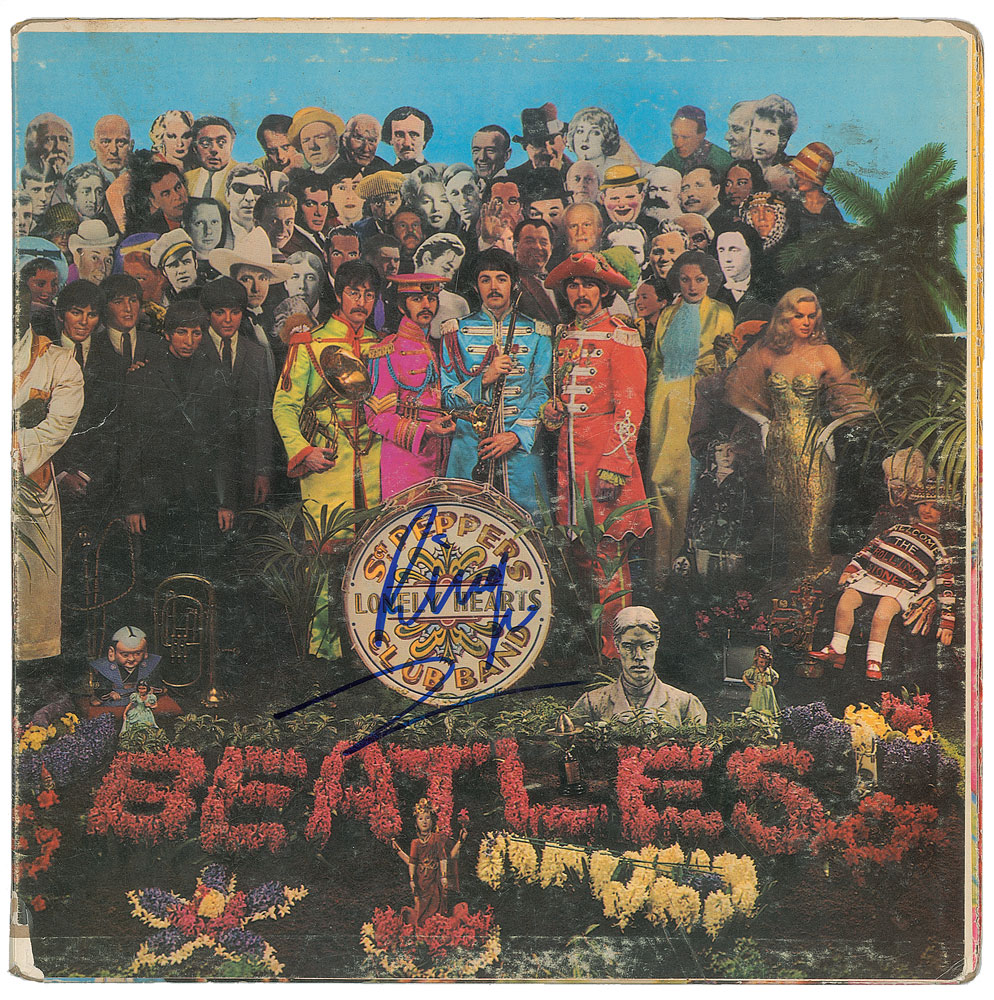 Sgt. Pepper's Lonely Hearts Club Band album signed on the front cover in blue felt tip, "Ringo." In very good condition, with scuffing, price sticker residue, and partial edge separation. The record is included. From The John Brennan In-person Autograph Collection.
