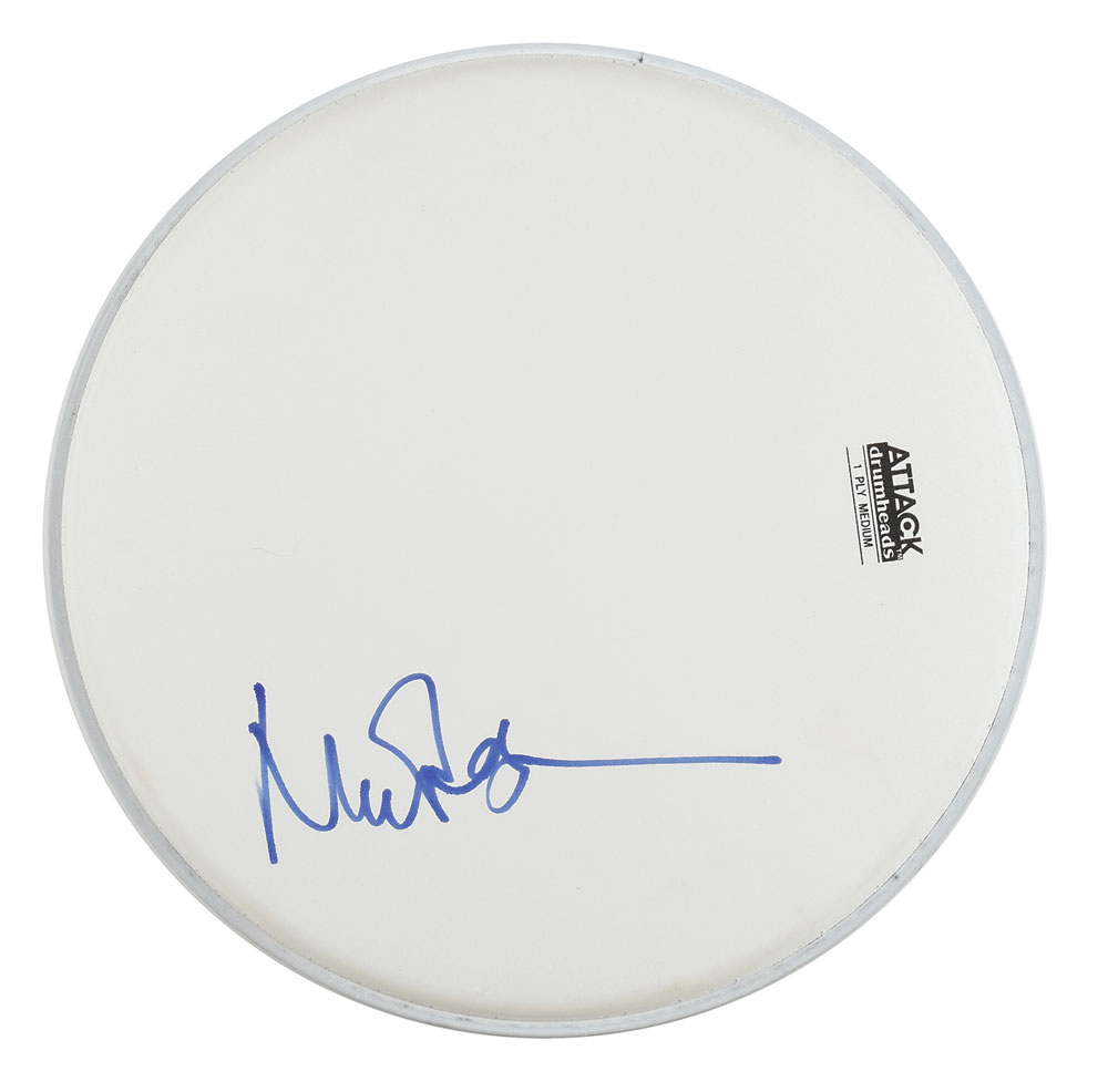Off-white coated Attack drum head, 12.5″ in diameter, signed in blue felt tip by Nick Mason. In fine condition. From The John Brennan In-person Autograph Collection.
