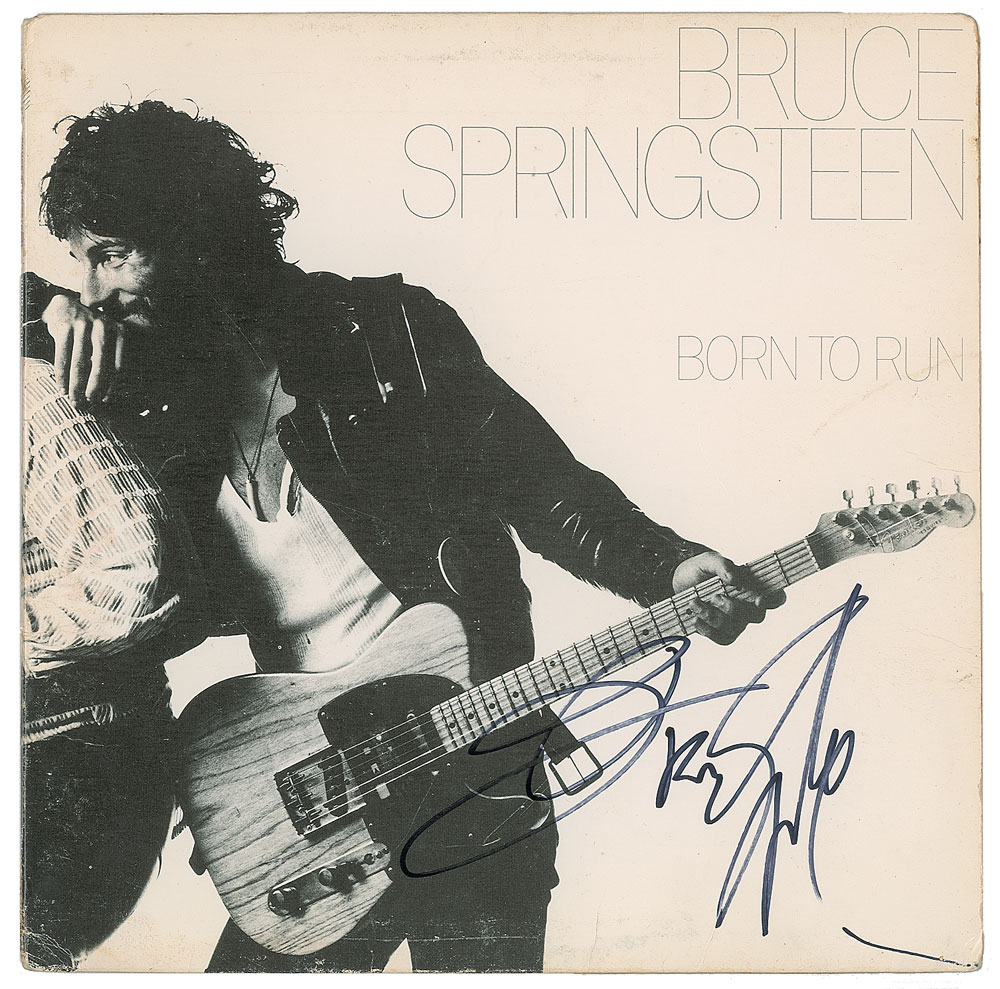 Born to Run album signed on the front cover in black felt tip by Bruce Springsteen. In very good to fine condition, with some creasing and gouging. The record is included. From The John Brennan In-person Autograph Collection.