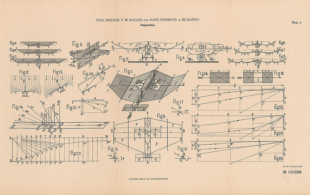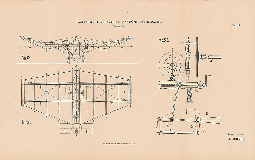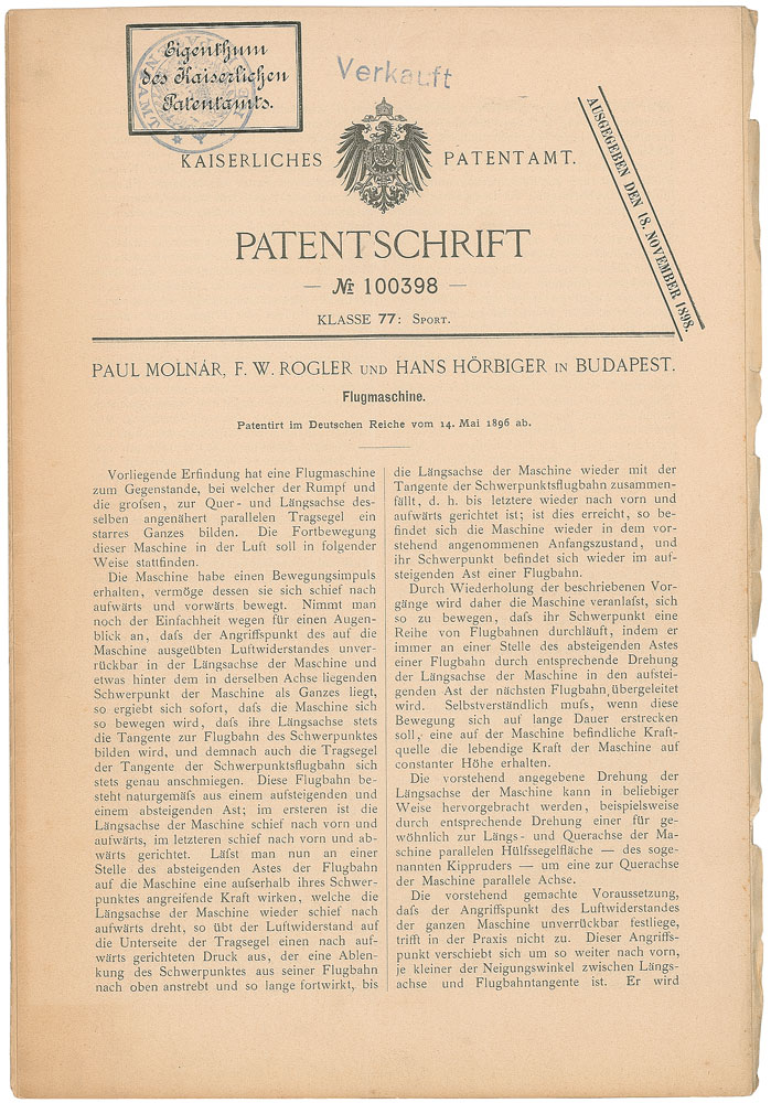 Printed booklet in German for an aviation patent granted to Paul Molnar, F. W. Rogler, and Hans Horbiger in Budapest for their "Flugmaschine [Flying Machine]," seventeen pages plus three fold-out diagrams, 7.5 x 11, November 18, 1898. In fine condition, with a light vertical fold.