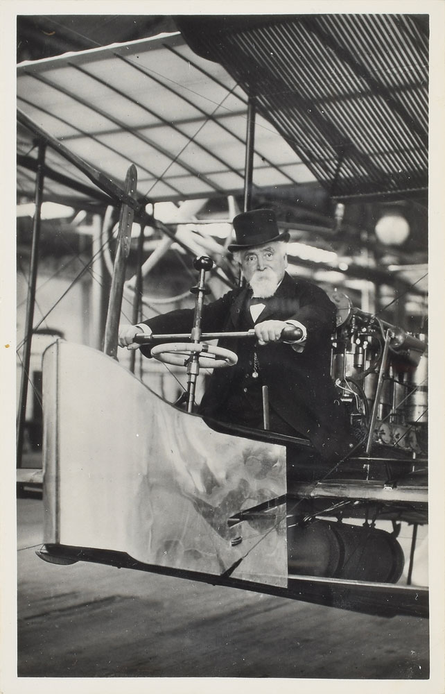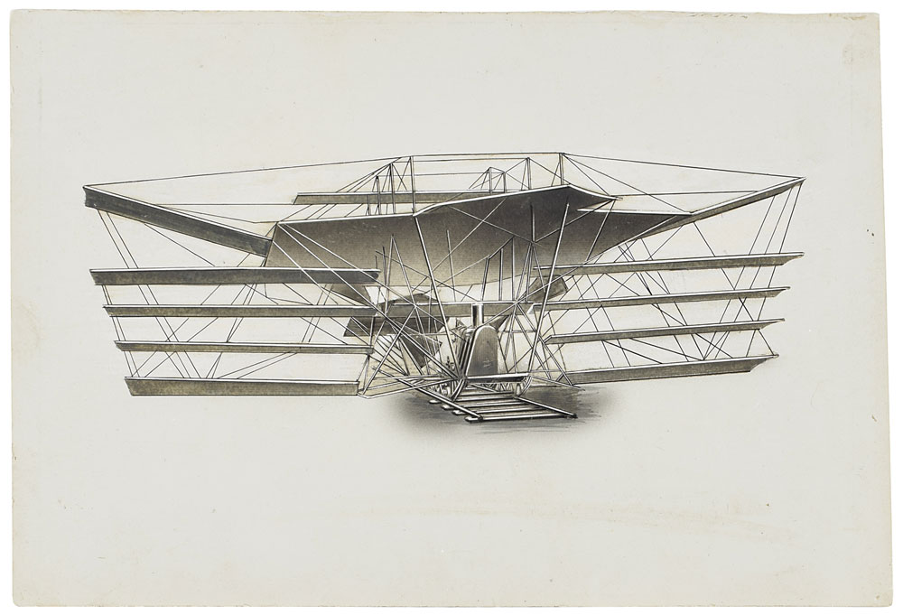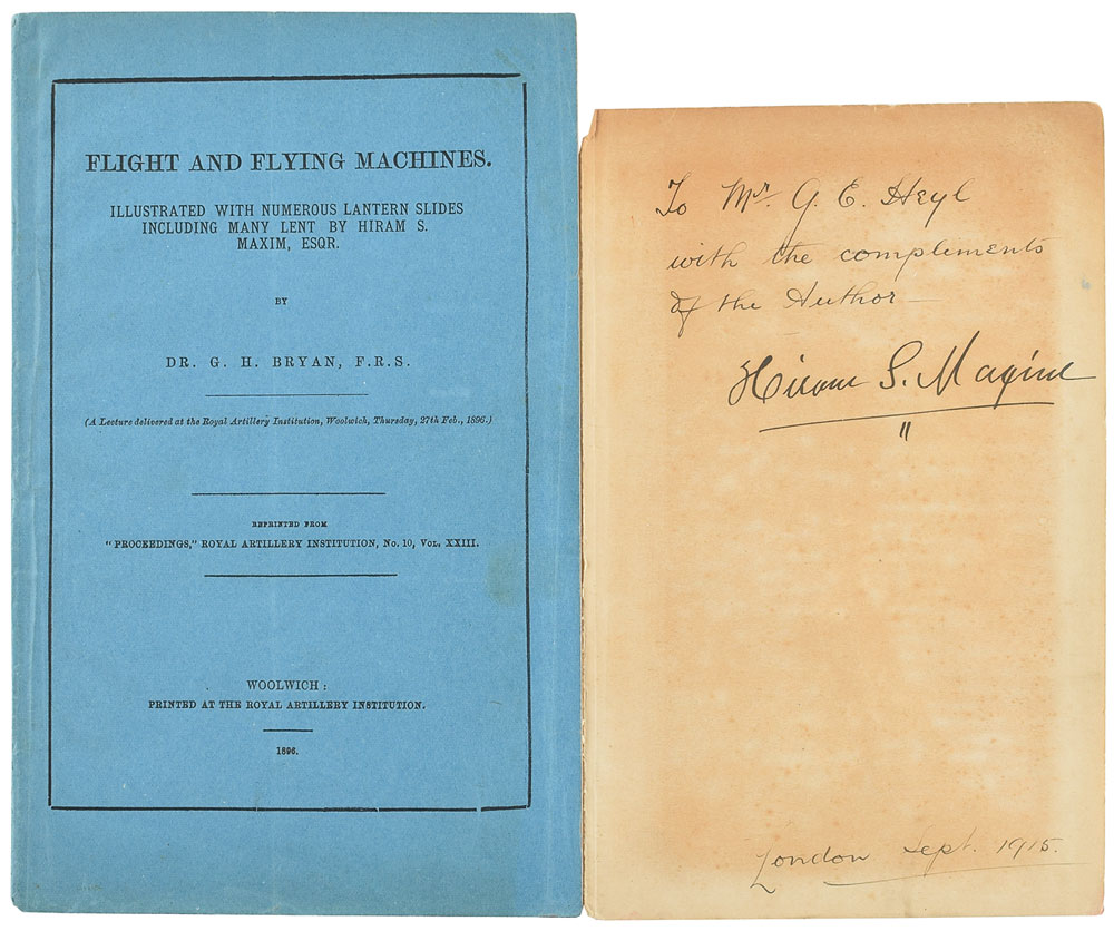 Group of four items associated with inventor Hiram Maxim (1840-1916), best known for inventing the first portable fully automatic machine gun, but who also experimented with powered flight. Includes: an ink signature, "Hiram S. Maxim," on an off-white sheet with an inscription in another hand, dated at London, September 1915; an original vintage 7 x 4.75 ink and gouache drawing of Maxim's 1894 flying machine executed in an unknown hand; a booklet entitled "Flight and Flying Machines: Illustrated with Numerous Lantern Slides including many lent by Hiram S. Maxim" by Dr. G. H. Bryan, published in Woolwich in 1896, 20 pages, 6 x 9.5, containing the text of a lecture delivered at the Royal Artillery Institution; and a glossy 3.5 x 5.5 photograph of Maxim in his airplane, printed later. In overall very good to fine condition, with spotty irregular toning to the Maxim signature.