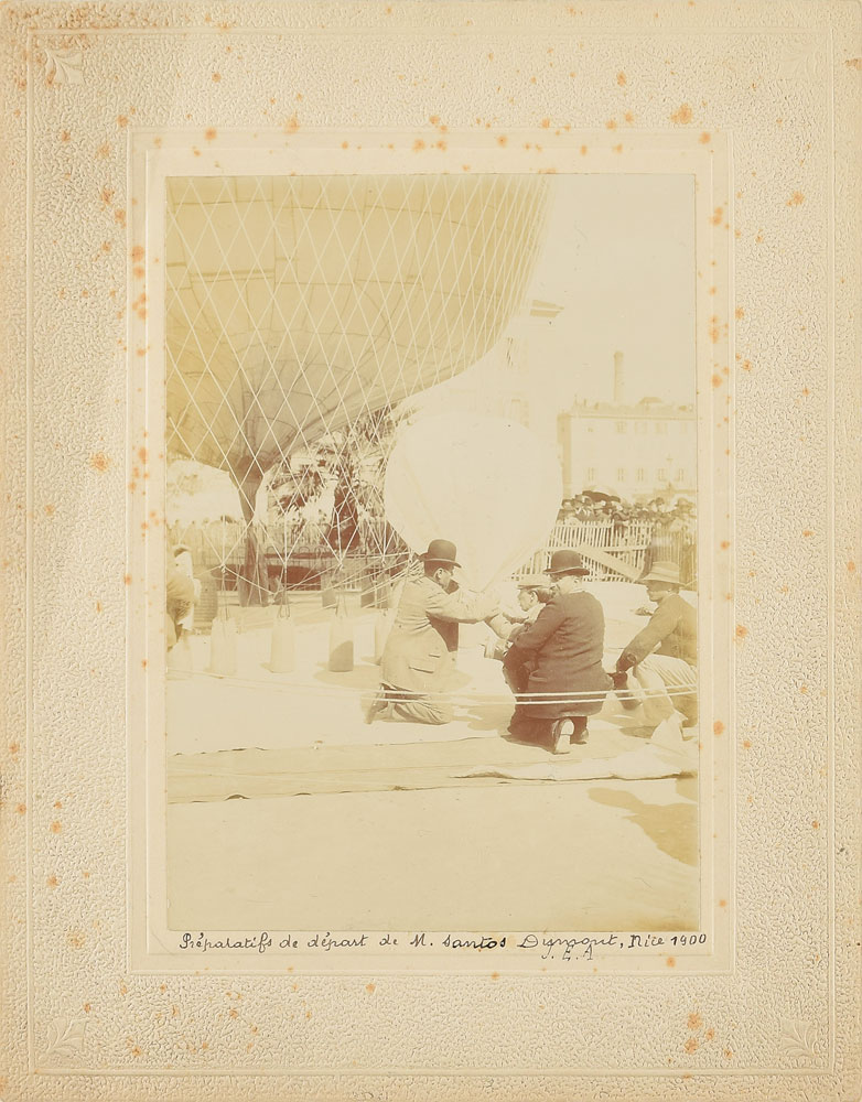 Four original vintage glossy 7 x 5 photographs of Santos aboard his No. 6 airship winning the Henri Deutsch de la Meurthe prize of 125,000 francs on October 19, 1901, for the first flight from the Parc St. Cloud to the Eiffel Tower and back in less than 30 minutes.