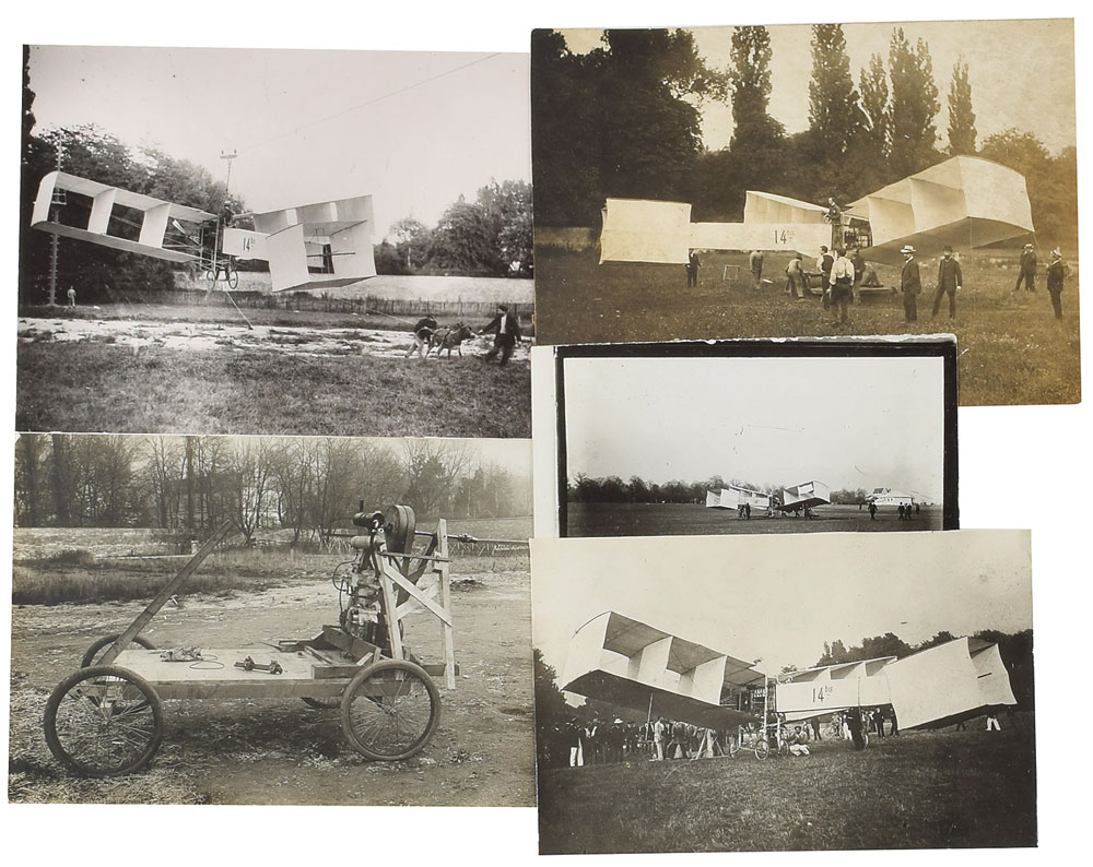Four original vintage photographs, ranging in size from 5 x 3.5 to 6.75 x 4.75, of the 14-bis at Bagatelle in October 1906, plus one photograph of the machine used to start the engine of the 14-bis.