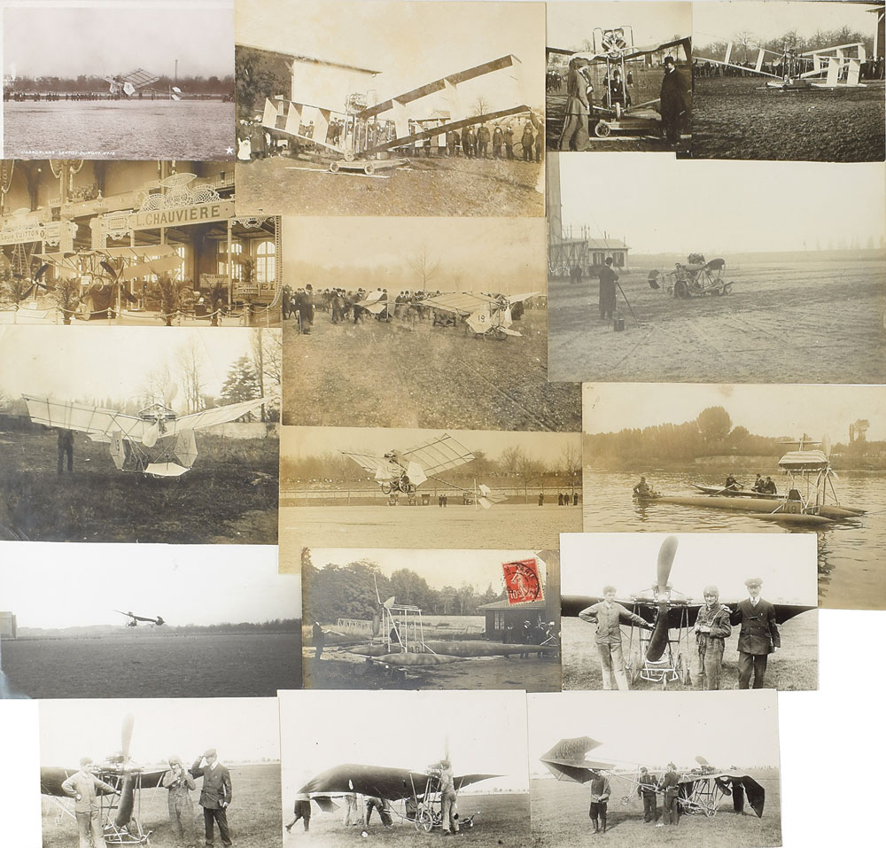 Seven original vintage photographs, ranging in size from a 5.5 x 3.5 postcard to 6.5 x 4.5, of the Santos No. 19 'Demoiselle,' built in an attempt to win the Grand Prix d'Aviation, plus four original vintage 5.25 x 3.25 postcard photos of Maurice Clement with the 'Demoiselle,' which was built by Clement-Bayard.