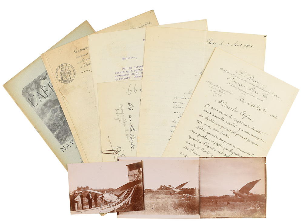 Collection of eight items relating to Louis-Francois Roux (1838-1921), a French architect and engineer who developed an early flying machine deemed a ‘steam mechanical bird.’ The group lot includes: three vintage photos, each approximately measuring 4.5 x 3.25, with one showing the bird-like machine resting on its rolling launch pad, and two others depicting the machine airborne, mere seconds after leaving the launch pad, with reverse of each dated either June 22 or July 2, 1904; a group of five untranslated letters in French, one TLS and four ALSs, each signed “F. Roux,” 15 total pages, with content relating to the progress of his mechanical bird; and a copy of the French monthly newsletter L’aeronaute from June 1904, 6 x 9.5, with pages 132 and 133 featuring a column by Roux. In overall very good to fine condition. Accompanied by a business card belong to Roux, and an original mailing envelope for the TLS.