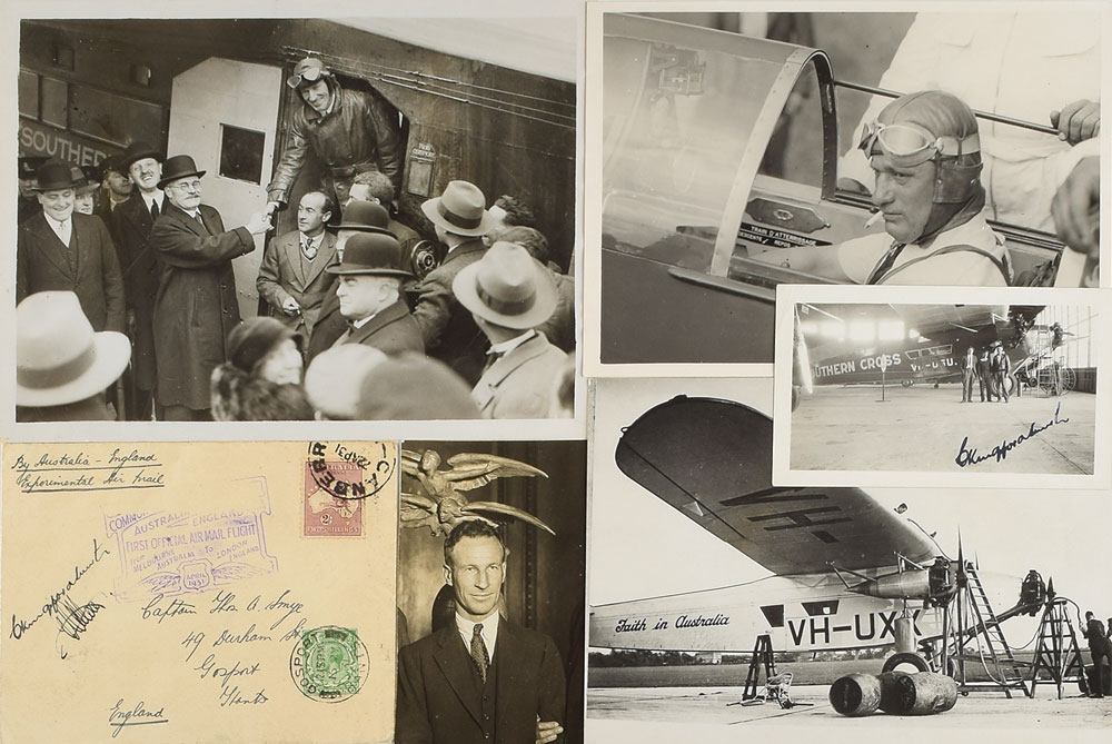 Group of six items related to Australian aviator Charles Kingsford Smith (1897-1935), who in 1928 made the first transpacific flight from the United States to Australia. Includes: a flown experimental airmail cover from the first official airmail flight between Melbourne, Australia and London, England, carried aboard Smith's 'Southern Cross' monoplane, signed in fountain pen on the left side, "C. Kingsford Smith"; an original vintage glossy 4.5 x 2.75 of Smith's 'Southern Cross,' signed in fountain pen, "C. Kingsford Smith"; and four original vintage unsigned photographs depicting Smith, ranging in size from 2.75 x 4.5 to 8 x 6. In overall very good to fine condition.