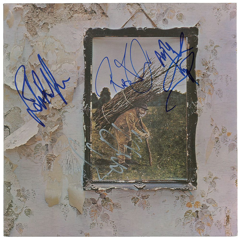 Fantastic untitled fourth studio album from Led Zeppelin, signed on the front cover in blue felt tip by Jimmy Page, Robert Plant, and John Paul Jones, who signs again in silver ink. In fine to very fine condition. The record is not included. A decidedly uncommon title in unusually excellent shape.