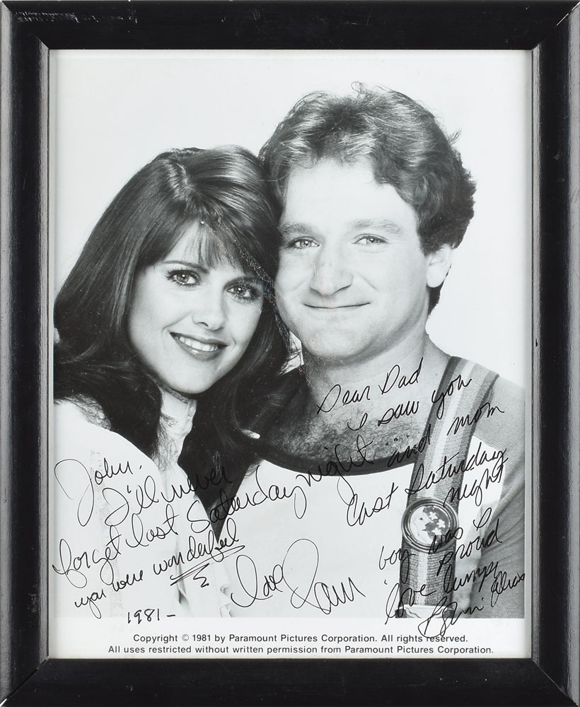Glossy 8 x 10 Paramount Pictures photo of Robin Williams and Pam Dawber, signed and inscribed in black felt tip to Jonathan Winters, "Dear Dad, I saw you and mom last Saturday, boy was I proud. Love lumpy, Robin Williams," and "John, I'll never forget last Saturday night…you were wonderful, Love, Pam, 1981.” Framed and in fine condition. The consignor notes that this originates from the estate of Jonathan Winters, who was Williams's mentor and comedic idol.