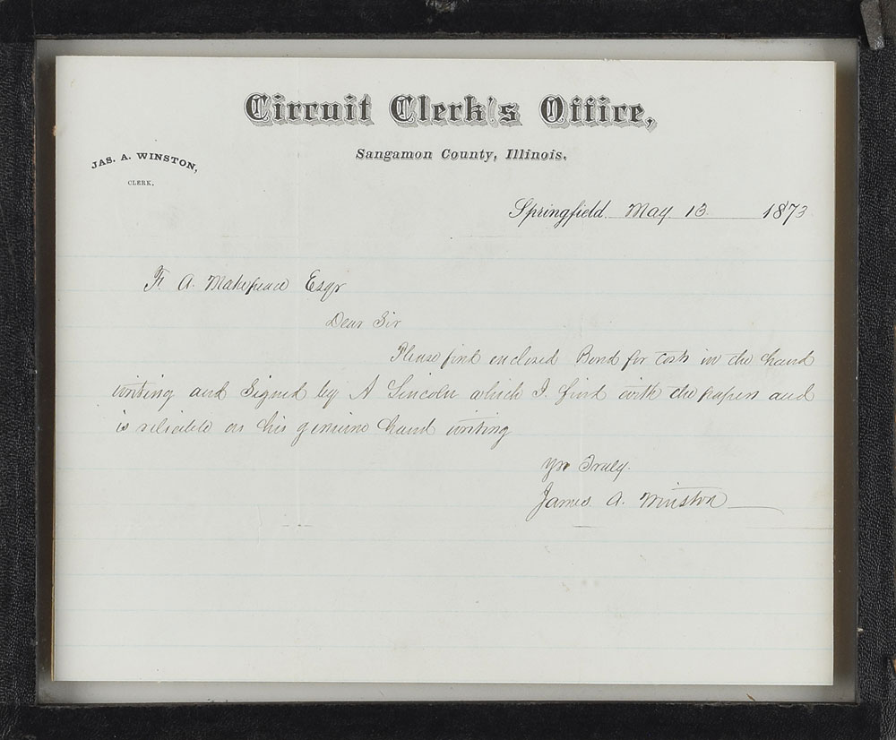 ALS signed “A. Lincoln,” 7.5 x 6, October 7, 1842. Superb official legal letter submitted to the Chancery in Sangamon Circuit Court, in the case of "Peter Van Bergen who sues for the use of Joshua F. Speed, vs. William Walters, Ann Idella Walters, & Charles Lanphier." In full: "I do hereby enter myself security for cost in this cause, and acknowledge myself beyond to pay a cause to be paid all costs which may accrued in this action, either to the appoints party or to any of the officers of this court in pursuance of the laws of this State." Framed between glass panels to an overall size of 8.75 x 7.25, with the reverse showing an 1873 letter from the Sangamon County Circuit Court Clerk's Office, in part: "Please find enclosed Bond for costs in the hand writing and signed by A. Lincoln which I find with the papers and is reliable as his genuine hand writing." In fine condition.
