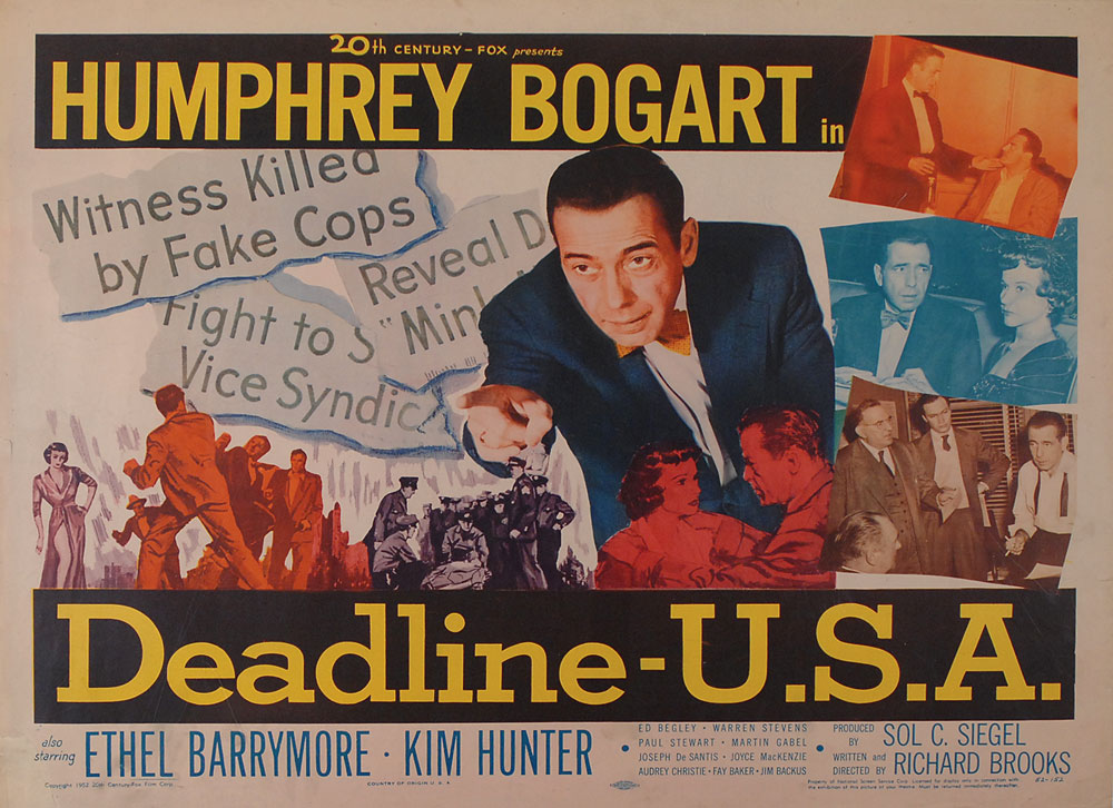 Original color 28 x 22 half-sheet movie poster for the 1952 film Deadline-U.S.A., starring Humphrey Bogart, Ethel Barrymore, and Kim Hunter, NSS no. 52/152. Poster features five different images of Bogart. In very good condition, with small edge tears and creases, replaced lower left corner, and scattered light toning and soiling.
